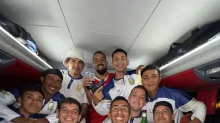 La imagen muestra a una decena de futbolistas cantando y celebrando en el colectivo, con botellas de fernet, vasos para el trago y dos armas que rápidamente generaron indignación y un fuerte debate en redes sociales. En cuestión de horas, el festejo dejó de ser anecdótico para transformarse en un escándalo.