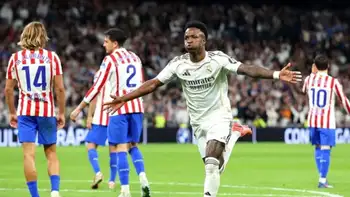 En el partido de la jornada en La Liga, una nueva edición del derbi madrileño se está quedando en el Bernabéu. Real Madrid venció 3-2 al Atlético Madrid por la fecha 29 y mantiene la distancia con Barcelona en la pelea por el título. A pesar de que los de Diego Simeone arrancaron ganando por el tanto de Ademola Lookman a pase gol de Giuliano Simeone, igualó Vinícius Júnior de penal y el uruguayo Federico Valverde (luego vio la roja) puso el 2-1. Un golazo de Nahuel Molina volvió a poner tablas, pero minutos después Vini marcó el doblete que le dio los tres puntos al Merengue en el clásico.
