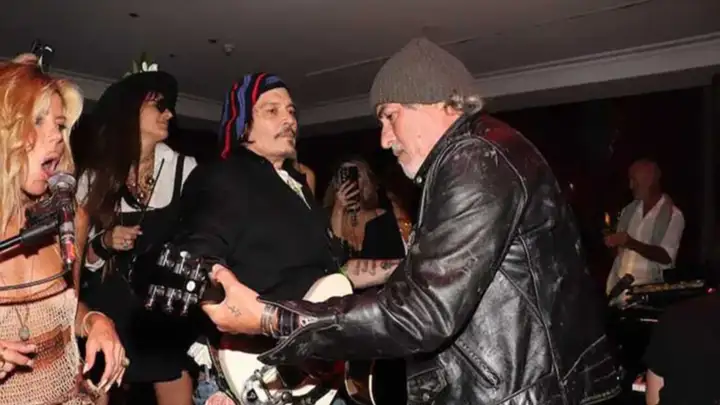 Pero lo que verdaderamente marcó la velada fue el giro musical: una vez concluida la cena, Depp y su amigo Jorge “Corcho” Rodríguez se sumaron al escenario del living del hotel, donde ya tocaba la banda local de la casa. Bajo la luz tenue y ante un público íntimo —invitados de la alta sociedad porteña y figuras del espectáculo— el actor tomó la guitarra y participó de una zapada espontánea.