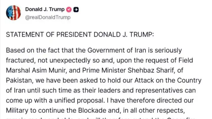 El presidente de Estados Unidos, Donald Trump anunció que extenderá un alto el fuego con Irán hasta que Teherán presente una propuesta para poner fin al conflicto de manera permanente, pero que continuará con el bloqueo naval de los puertos iraníes.
