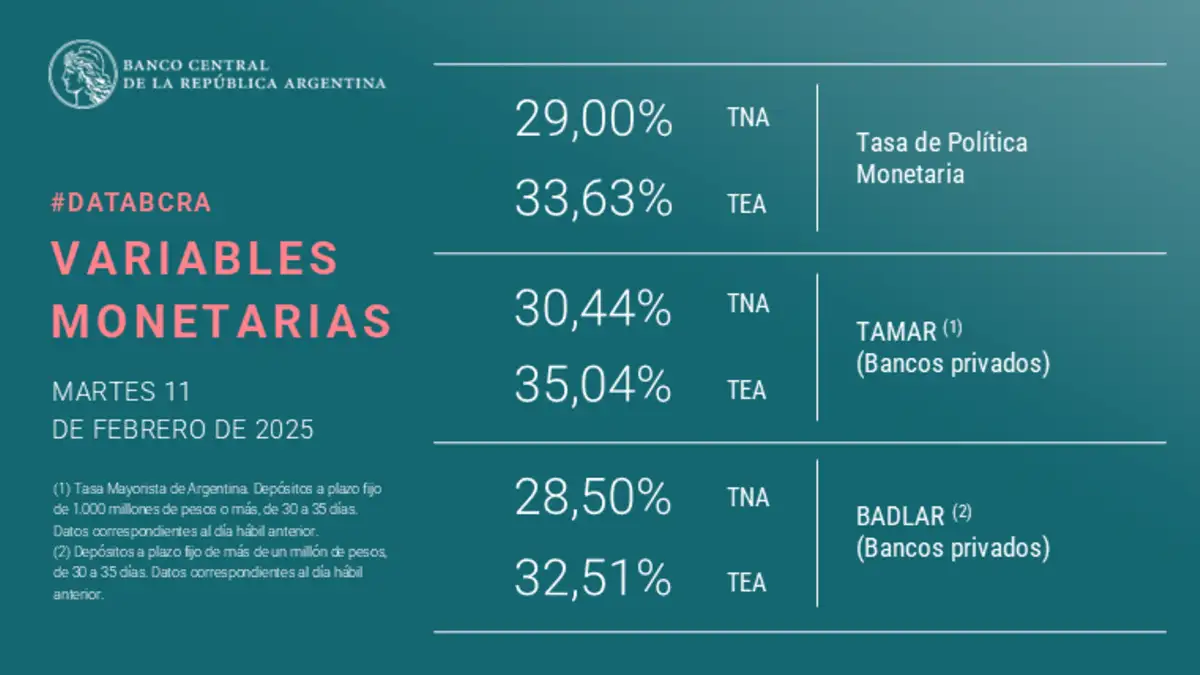El Banco Central de la República Argentina (BCRA) anunció una reducción de 10 puntos porcentuales en la tasa que remunera por sacar pesos de circulación en el mercado interbancario, pasando del 35% al 25% anual. Esta medida se implementó el 24 de septiembre de 2025, poco después de que el Tesoro estadounidense comunicara un paquete de apoyo financiero a Argentina.