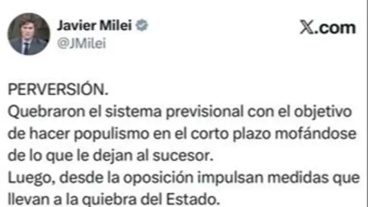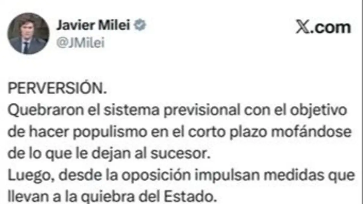 A través de un mensaje publicado en su cuenta de X, Milei cuestionó las jubilaciones otorgadas a personas sin aportes durante los gobiernos kirchneristas y sostuvo que esas decisiones respondieron a una lógica de populismo de corto plazo, sin medir las consecuencias a futuro. Según planteó, esas políticas terminaron quebrando el sistema previsional y dejando una pesada herencia para las administraciones siguientes.