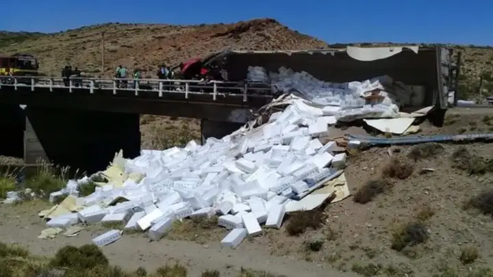 Un camión que transportaba salmones perdió el control y terminó volcando en la Ruta 22. El hecho se produjo alrededor de las 18:30 horas en la zona del cruce de Mariano Moreno y Ruta 22.