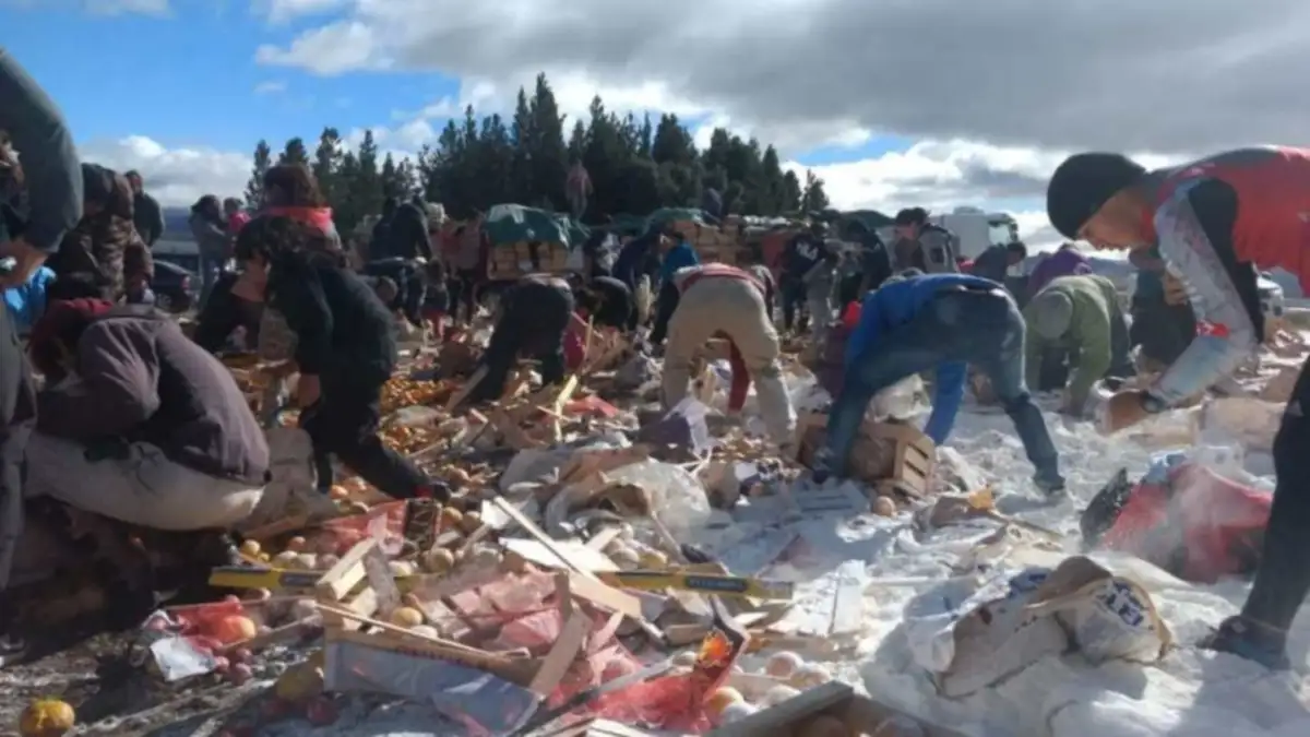 Un camión con semi remolque que había partido de Neuquén y se dirigía a Esquel volcó esta mañana la casi totalidad de su carga en la ruta 40, en el acceso a Bariloche, y decenas de personas concurrieron al lugar para llevarse la mercadería que pudieron rescatar.