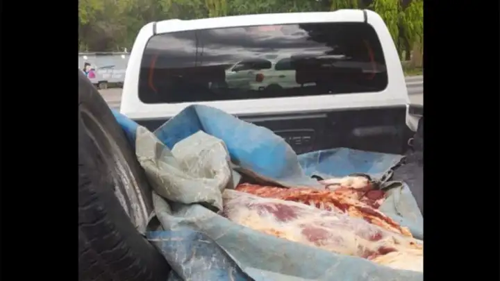 Debajo de una lona muy sucia y bastante rota, encontraron dos costillares y otros cortes de carne que estaban tirados arriba del protector de plástico sin ninguna medida sanitaria, además de no contar con refrigeración pese a la alta temperatura que hizo ayer por la tarde en la región.