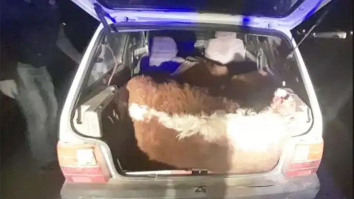 Apenas cayó la noche, con el botín en su poder, tres hombres emprendieron el regreso a la ciudad. Para eso tuvieron que ser muy precisos para poder acomodar los tres terneros que habían matado dentro de un pequeño y bastante deteriorado Fiat Uno. Pero el auto no soporto semejante peso y quedó inclinado notablemente hacia el tren trasero, ese detalle fue detectado en un control policial de rutina y fueron finalmente detenidos.