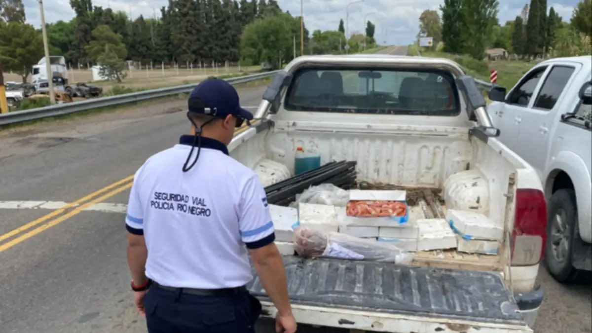 Un hombre de Puerto Madryn transportaba langostinos y salmón en la caja de su camioneta, sin cadena de frío ni documentación sanitaria. El operativo se realizó en Pomona, sobre la ruta Nacional 250, y terminó con el decomiso de la mercadería y su posterior destrucción.