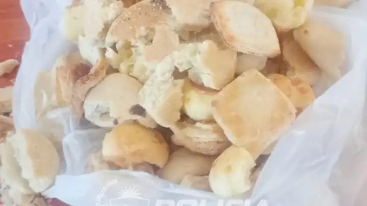 Al realizar el correspondiente control de los elementos, el personal policial detectó envoltorios de nylon transparente ocultos en el interior de productos alimenticios tipo chipa, los cuales contenían una sustancia sólida sospechosa.