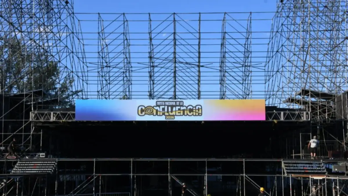 El emblemático escenario Confluencia está prácticamente terminado y marca el inicio de la cuenta regresiva para la Fiesta Nacional de la Confluencia 2026, uno de los eventos más convocantes de la Patagonia. Durante la jornada se avanzaba con la colocación del techo, paso previo a la instalación del sonido, las luces y el elevador que permitirá un acceso más cercano de los artistas al público.