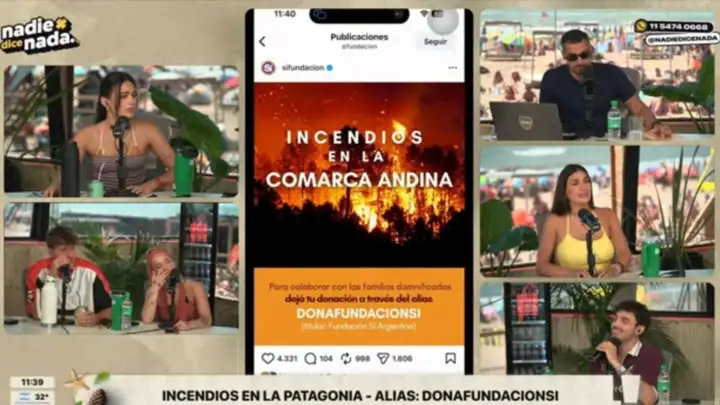 En un momento, colocaron un zócalo con el alias para donar para los incendios que afectan a la Patagonia, mientras mostraban imágenes del nivel de gravedad, hablaban sobre los hechos y la intencionalidad del fuego, que ya fue confirmada por el propio gobernador Ignacio Torres.
