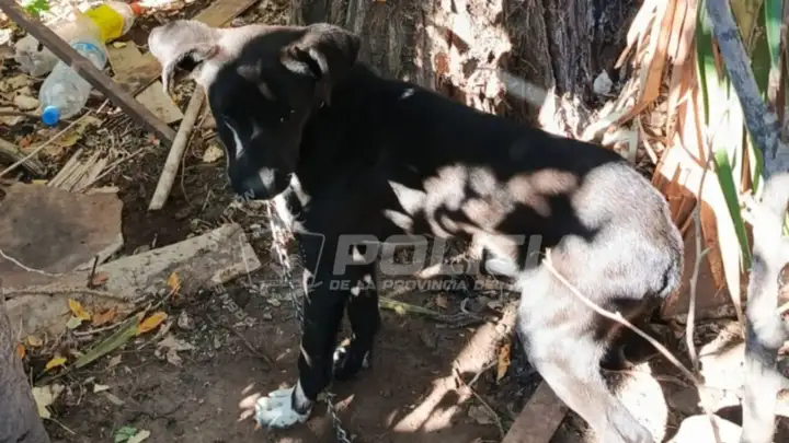 Al llegar al domicilio, los efectivos hallaron a un perro mestizo de pelo negro con una mancha blanca en la zona del pecho en condiciones inadecuadas: presentaba movilidad reducida, no tenía suficiente acceso a agua ni alimento. El animal tampoco contaba con resguardo, como una cucha o similar, frente a las condiciones climáticas.